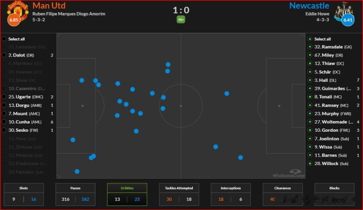 因为有了乌加特的中路覆盖,加上芒特+库尼亚在前场的逼抢,所以纽卡斯尔想要后场出球,更多依赖个人冲破 能力,所以你看看纽卡斯尔的过人位置图(上图),23次过人基本集中在中路、纽卡斯尔的右路。