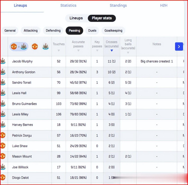 在谈纽卡斯尔的攻击 之前,你先看看本场赛事 的传中球,两个翼锋戈登、墨菲都拿出了10次以上的传中,全场赛事 纽卡斯尔一共尝试了42次传中,效果其实并不算理想,上一场赛事 纽卡斯尔就是利用传中球、五号位沃特玛德抢前点上演连进两球的。