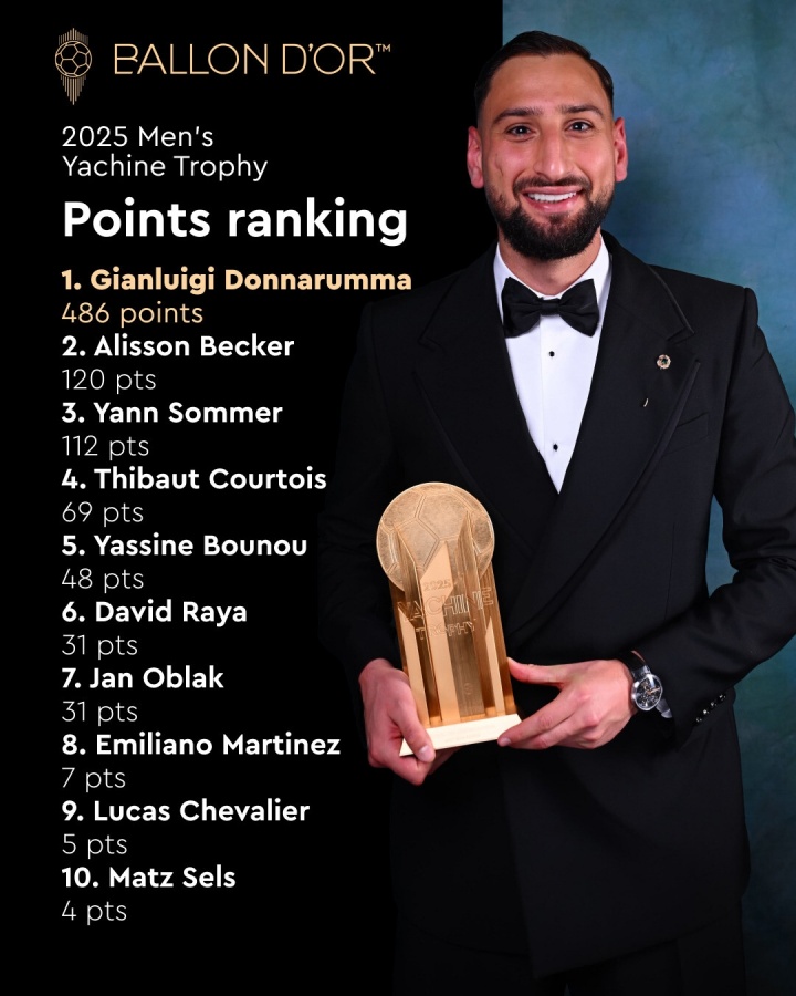 09月27日讯 2025年雅辛奖排名详情公布,荣获该奖项的意大利守门员多纳鲁马以486分断层领跑 ,免费欧洲杯直播第2名阿利森获得120分,第3名索默获得112分。