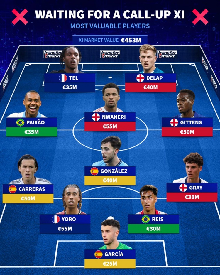 无缘国家队身价最高阵形 (总价4.53亿欧,欧洲杯直播指从未入选国家队)