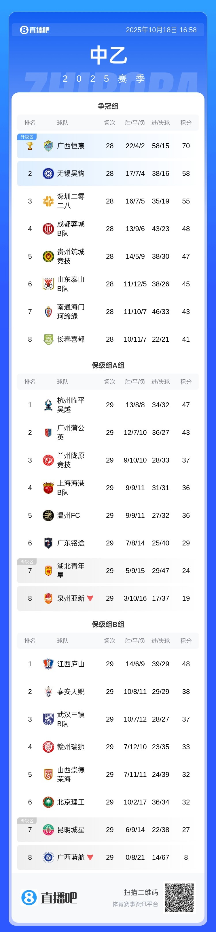 10月18日讯 中乙保级组第29轮,湖北青年星1-3不敌温州FC,欧洲杯直播昆明城星0-1不敌泰安天贶,双双降入中冠。