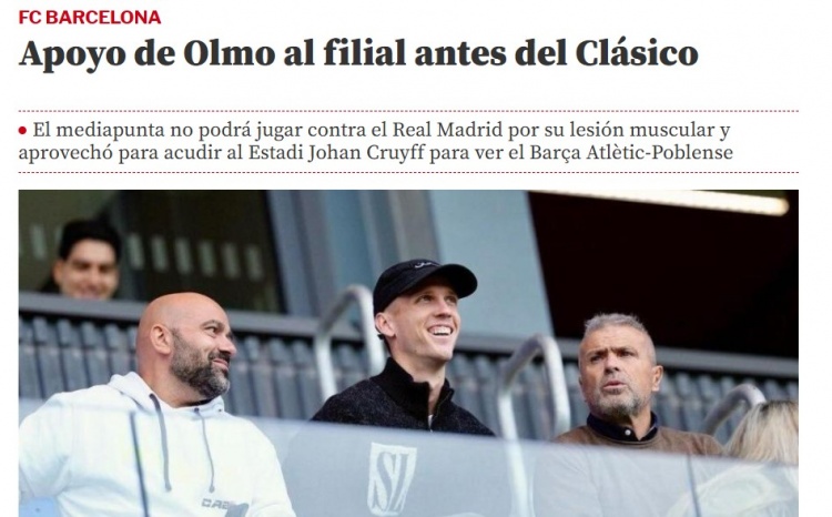 10月26日讯 巴萨中场球员奥尔莫因伤无缘本周末的国家德比。《世界体育报》报道,奥尔莫本周日前往观看巴萨B队的赛事 。