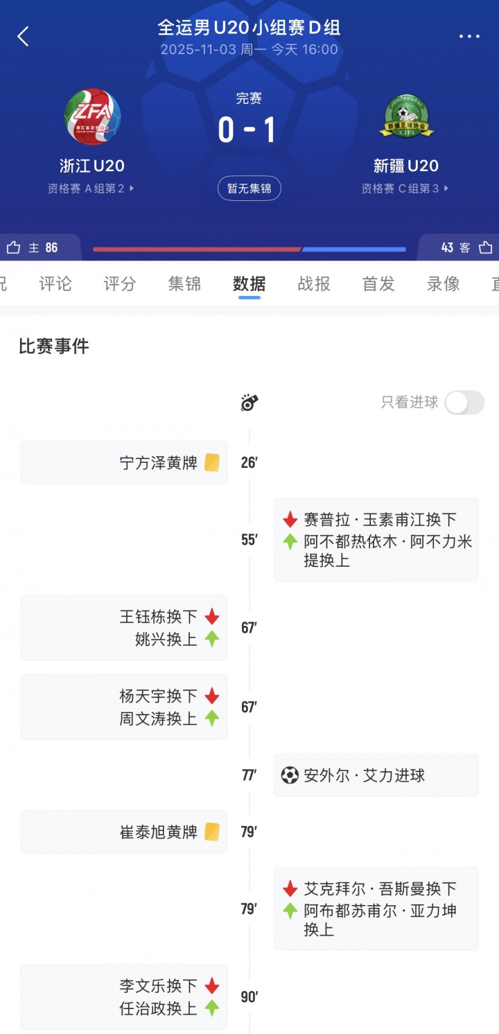 攻击 段只打雷不下雨,防卫 端也难以固若金汤。赛事 第77分钟,新疆队打出流畅反击,前场球员安外尔-艾力危险区域 前推射入网,打破比分僵局的同时,也将浙江队的命运推向了悬崖边。最终,浙江队在自己的全运首战中0-1负于新疆队,出师不利。