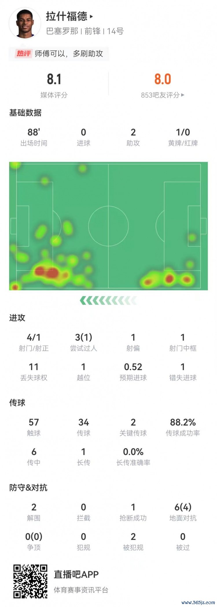 拉什福德本场2助功 +2关键传送球 4射1正1中框+6传中 获评8.1分